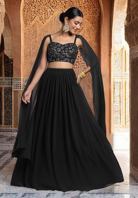 Black Lehenga Set With Swarovski Hand Embroidered Cape Sleeve Blouse
