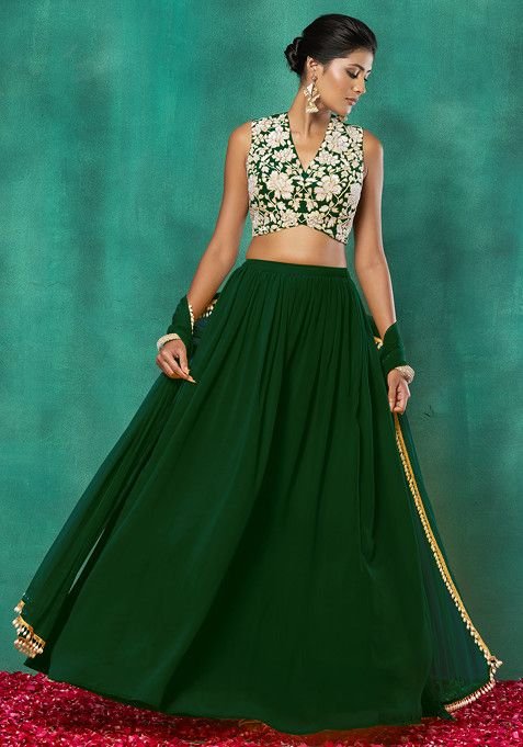 Emerald Green Lehenga Set With Floral Sequin Hand Embroidered Blouse And Choker Dupatta