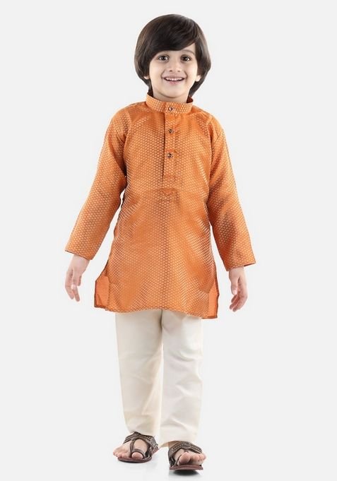 Orange Jacquard Kurta With Pants (Set of 2)
